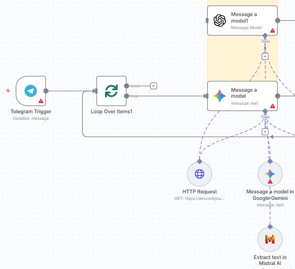 - This workflow connects a Telegram bot to Google Gemini (PaLM API) so the bot can reply to users with AI-generated answers.